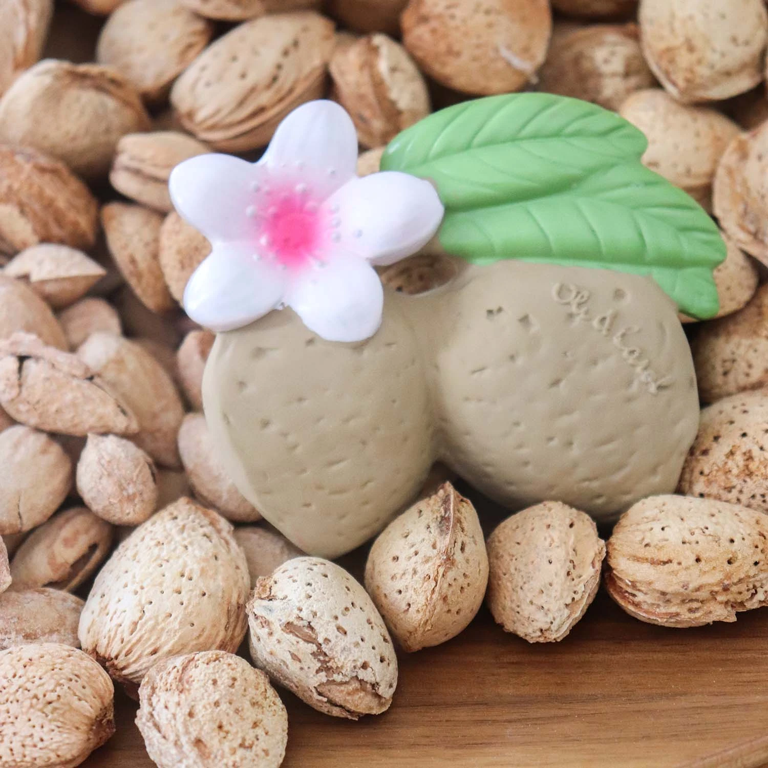 Aly the Almond is a teether, bath toy and sensory play toy for babies. Its almond-shaped design makes it easy for babies to hold while teething in a safe toy! Easy-to-hang from a strap and take it everywhere you go! – Healthy tip: Did you know that almonds make us have strong teeth and bones? Introduce little ones into nature & fruits that surround them!
