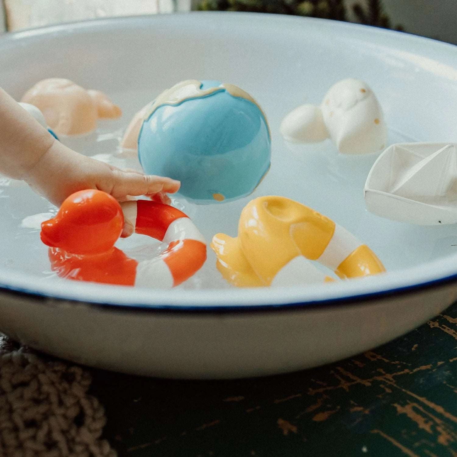 Made from 100% natural rubber & hand painted one by one with natural pigments. Made all in one piece with no hole, preventing the creation of bacteria inside.
