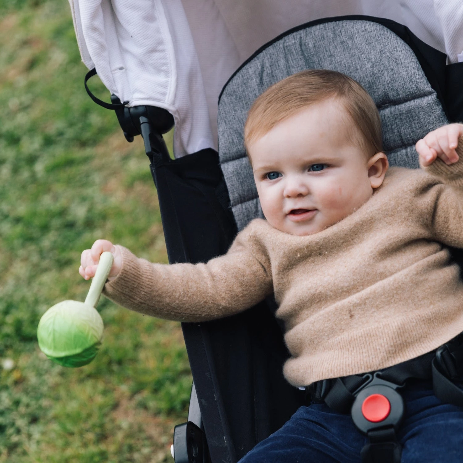 New revolutionary concept! Oli&Carol’s Green Cabbage Rattle Toy is the GREENEST RATTLE IN THE MARKET! Its exterior is made of 100% natural rubber, and inside are upcycled cherry seeds that turn this teether into a rattle. 2 in 1!
