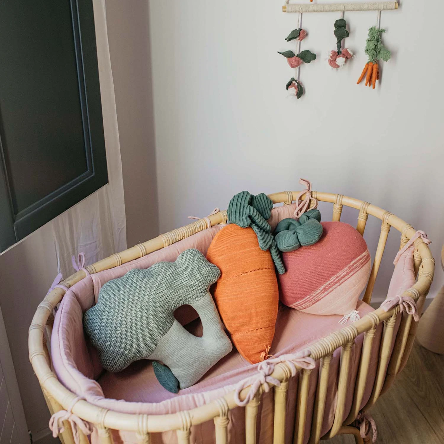 Soft and natural Cathy the Carrot cotton cushion is in town to introduce kids into loving veggoes from a young age! Let little ones nibble on their radishes while being in a garden-themed room filled with textile veggies, such as this soft, veggie-shaped cushion.
