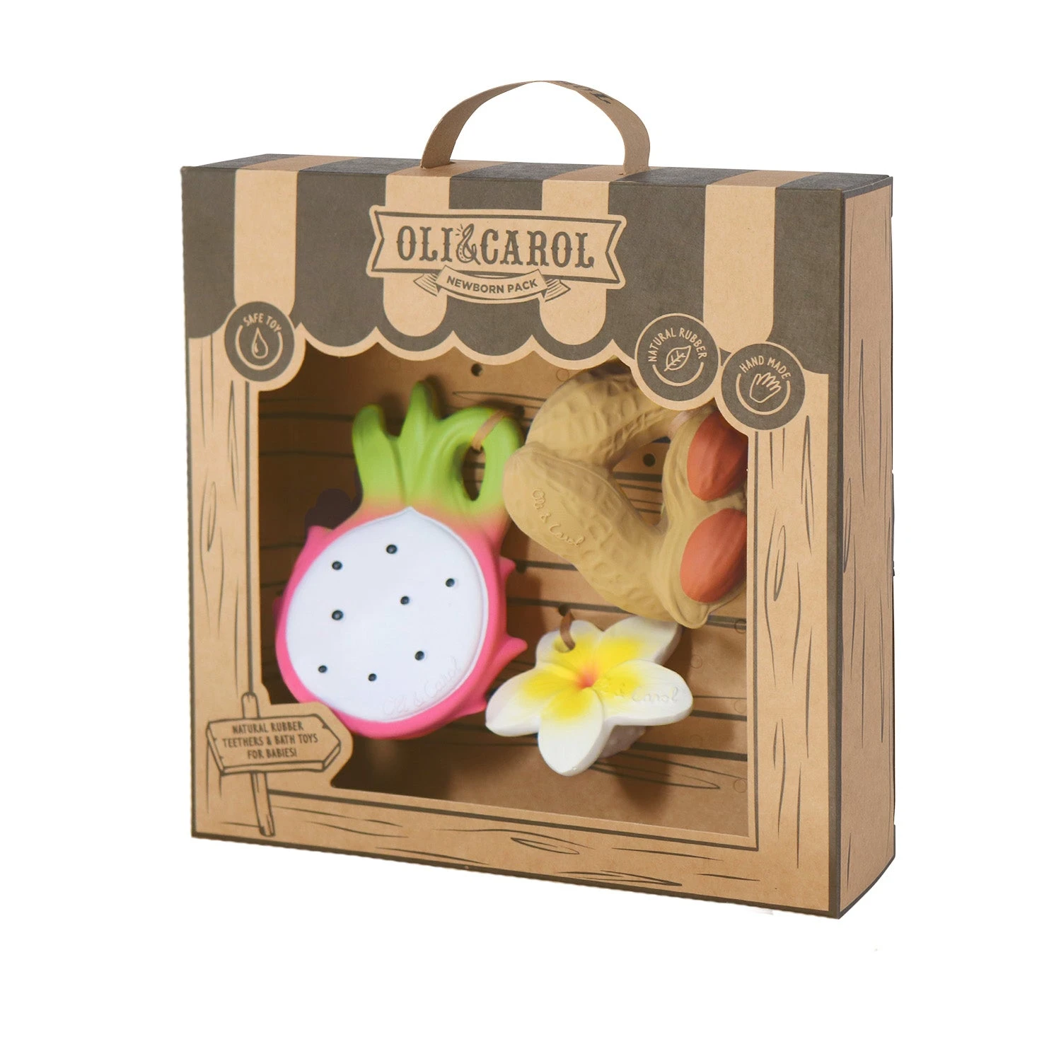Tropical combo! A colorful set is here to stay: two baby teethers for babies and a mini teether for newborns. A gift for babies 0+ including three natural rubber teethers full of textures and ergonomic shapes that will stimulate babies senses. The best option to soothe teething gums that will grow with babies from newborn stage onwards. Comes with a custom-made packaging, ready to gift!Â