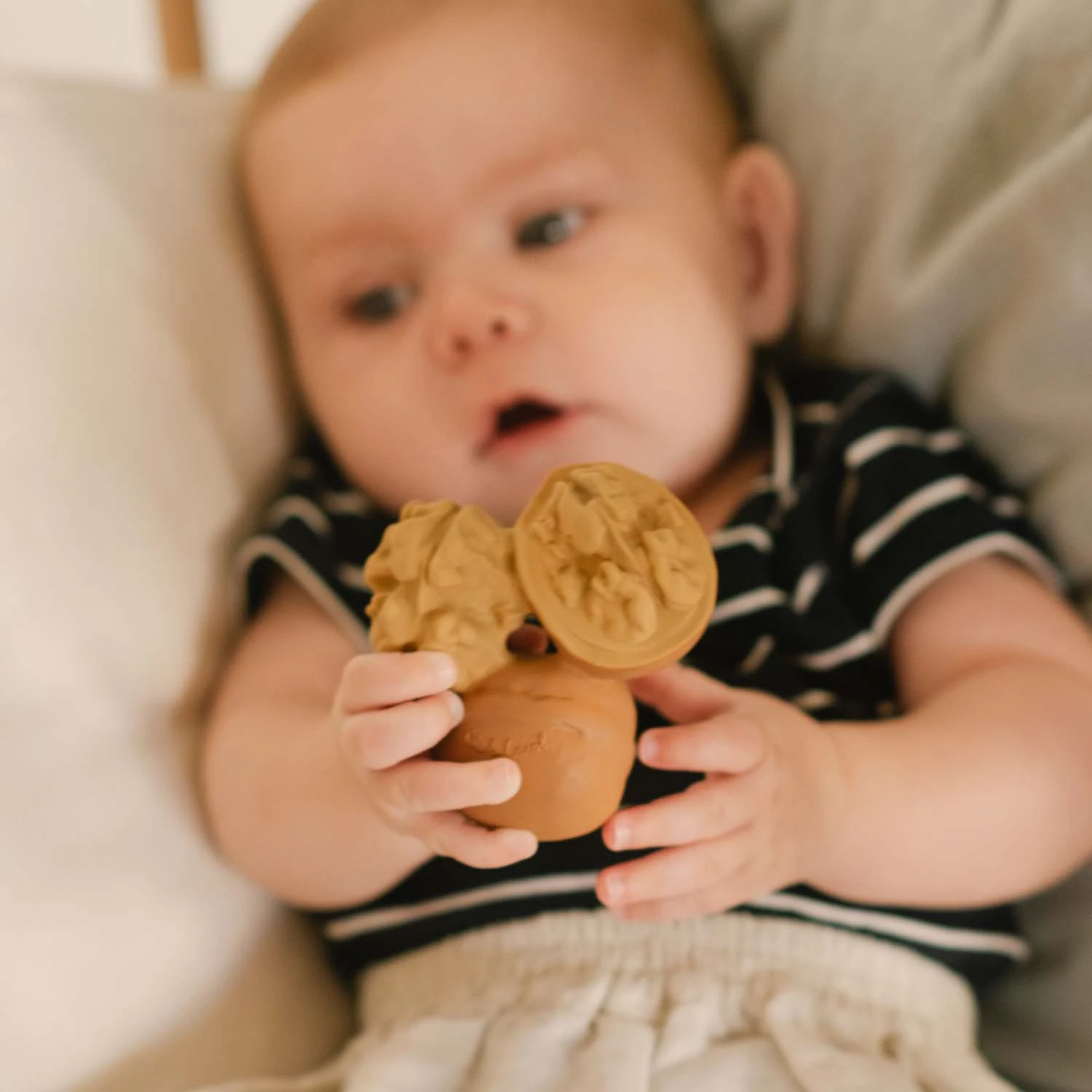 Nutty the Walnut is a nut-shaped teether, bath toy & sensory play toy for babies. Its realistic design will stimulate their senses and soothe teething gums. Its design with a hole in the middle makes it easy-to-hang from a strap & take it everywhere you go! – Healthy tip: Did you know walnuts are a great nutritive source for the brain? Introduce little ones into nature & fruits that surround them!
