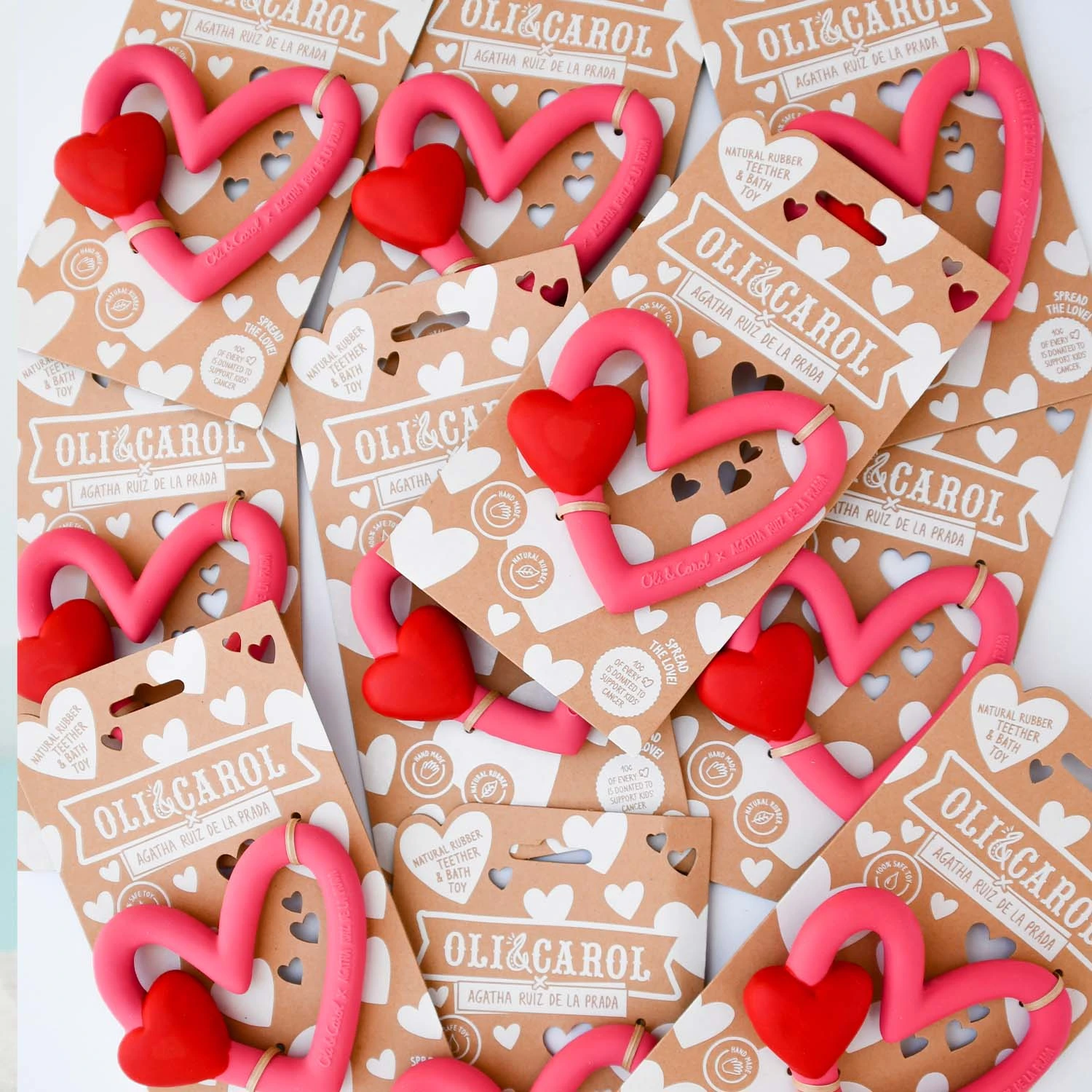 Spread love with Oli&Carol x Agatha Ruiz de la Prada teether, bath and sensory play toy. This vibrant heart-shaped toy is the ultimate representation of love and friendship of Oli&Carol. It will help babies and kids learn how loving other human beings makes us stronger and better persons while placing it around the wrist.