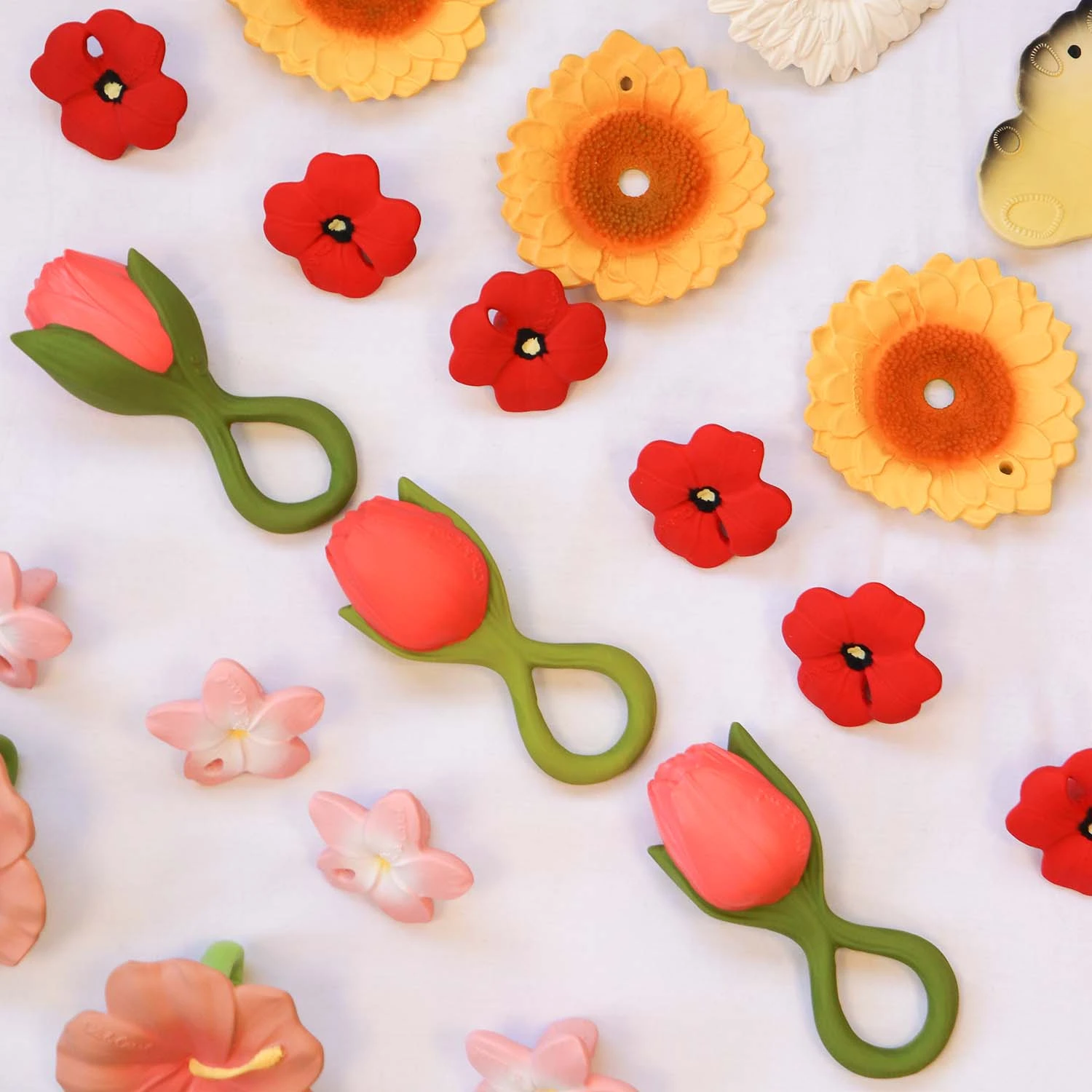 A bouquet for your loved ones! Theo the Tulip is a teether, bath toy & sensory play toy for babies. Its ring makes it easy for babies’ little hands to hold while chewing on a safe natural teether. A wide variety of texture will also stimulate babies’ senses and soothe teething gums. Make kids love the environment that surround them with our Garden family!